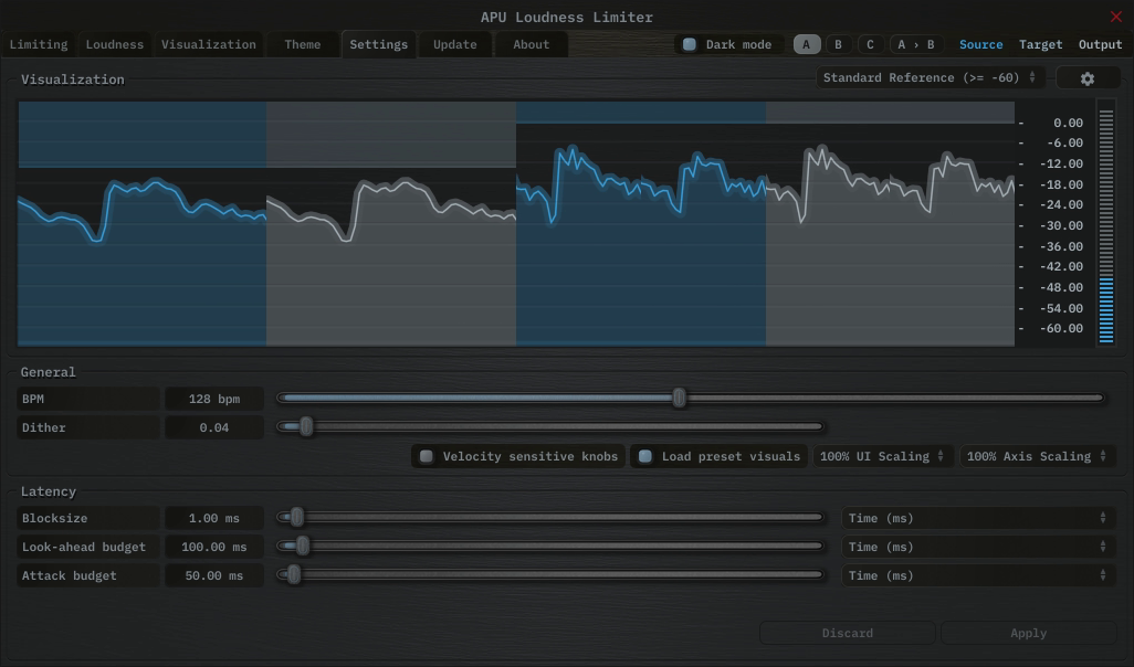 The settings tab contains various additional parameters. These parameters are broken down between General and Latency parameters. Since Latency parameters impact delay compensation, changes to these parameters are deferred until you click the Apply button. It is generally not advisable to automate the parameters in the Latency section.